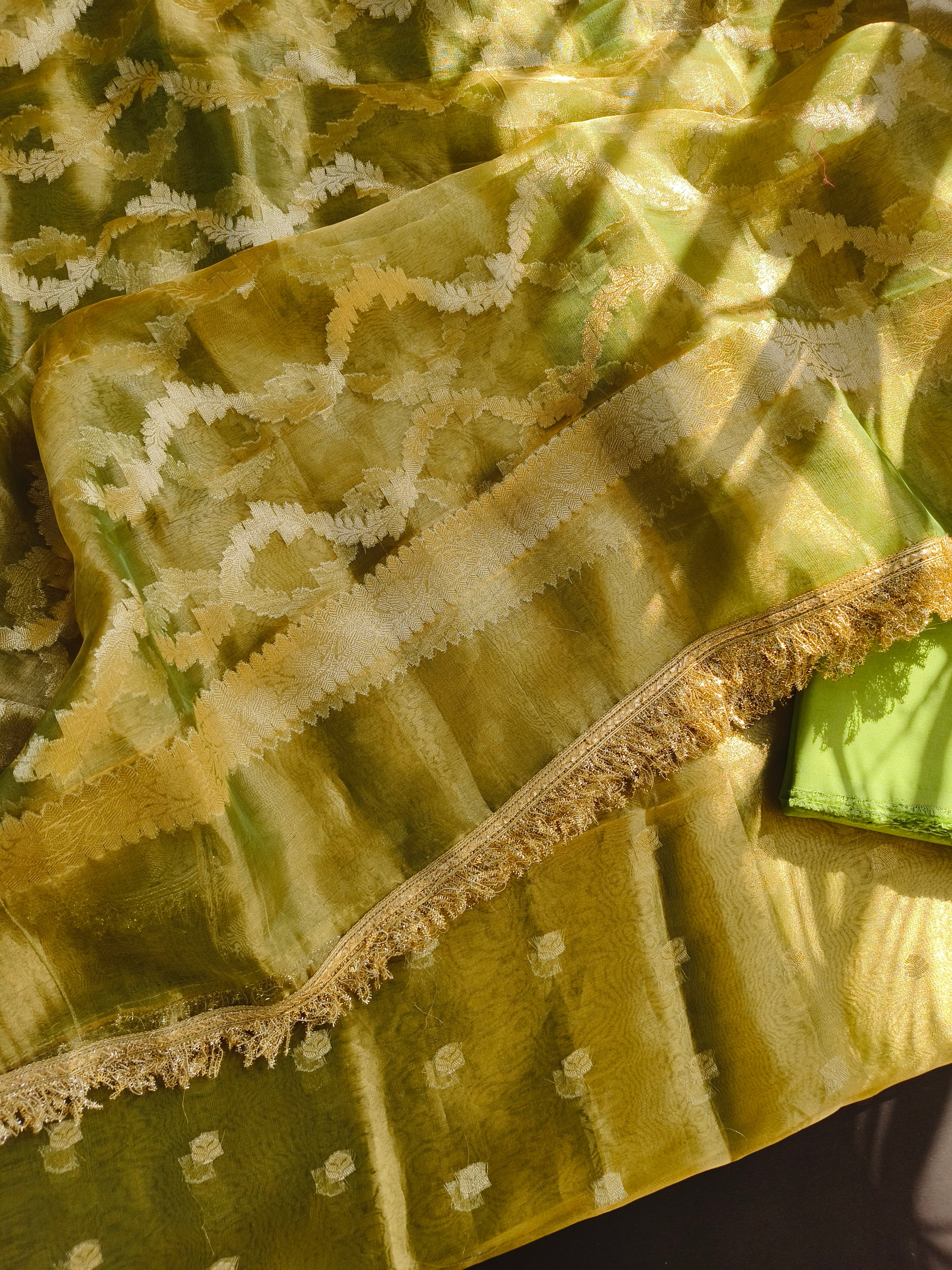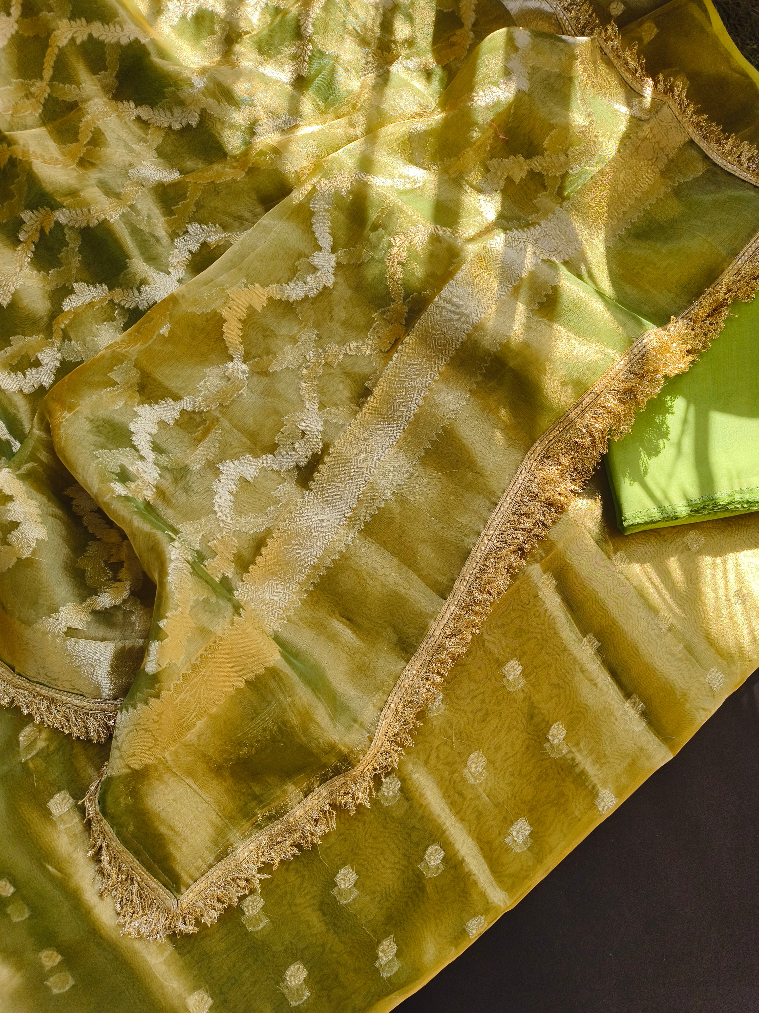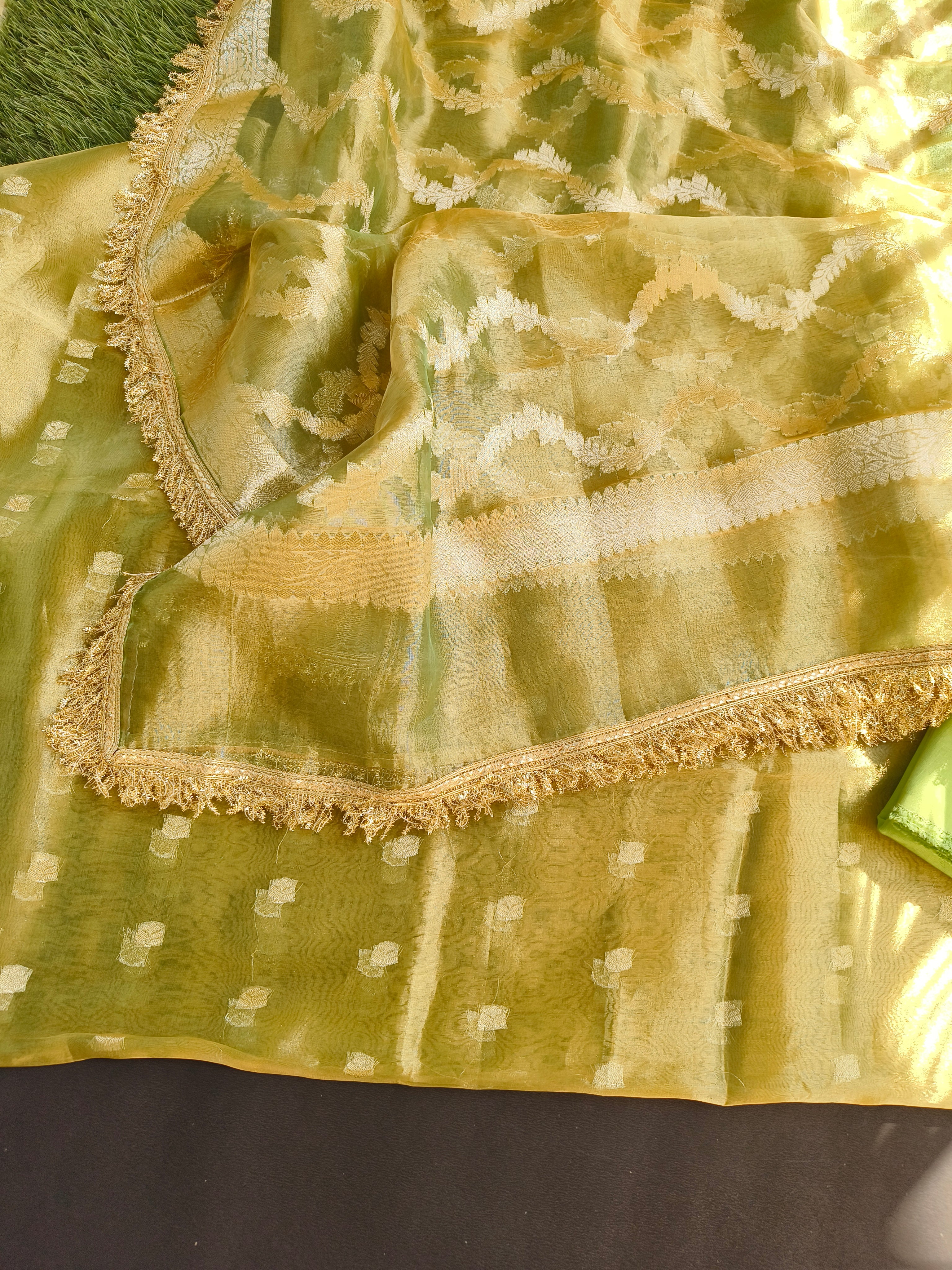 Indulge in the luxurious feel of our pure Tissue suits with kiran all over dupatta and tissue kurta with bootas. The kiran dupatta adds a touch of elegance, while the tissue kurta with bootas exudes sophistication. Upgrade your wardrobe with these stylish and comfortable suits.